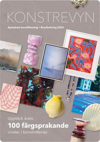 Varje höst publicerar vi en ny utgåva av Konstrevyn. Här finns foto och nummer på samtliga verk som ingår i årsutlottningen samt uppgifter om verkets namn, mått, teknik, prisklass samt konstnärens namn.